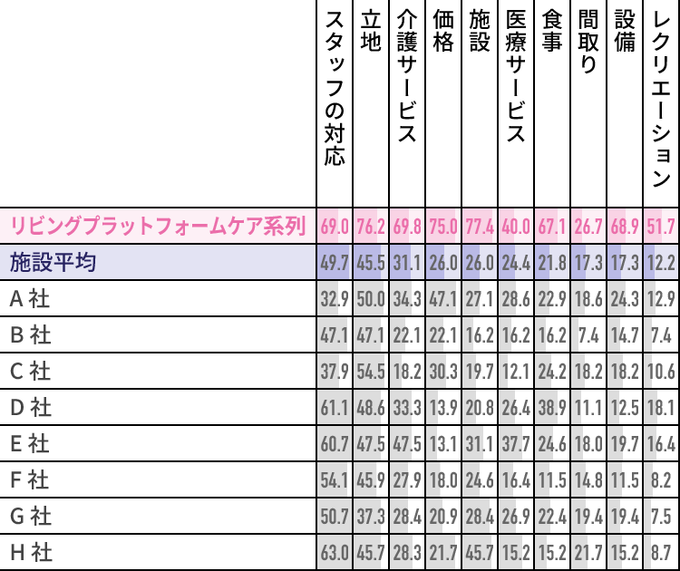 見学や事前説明だけでは分からない、スタッフの日々の対応や、レクリエーションの頻度・内容、施設の使いやすさなど実際の暮らし。リビングプラットフォーム系列の施設では様々な点で入居者様・ご家族から高い満足度を頂いています。